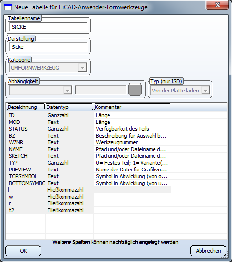 - Geben Sie bei Tabellenname SICKE und bei Darstellung Sicke ein.