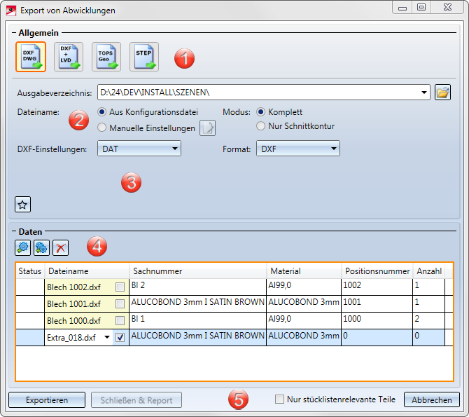 Haben Sie diese Option aktiviert, werden nur Abwicklungen in die Exportliste übernommen deren Blech bei den Teileattributen die Stücklistenrelevanz berücksichtigt. |