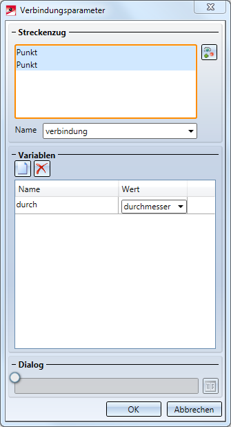 - Diese Änderung bewirkt, dass bei der Verbindung zusätzlich zu den Schnittpunktkoordinaten auch der Wert der Variablen durchmesser der Eternit-Platte als Variable namens durch übergeben wird.