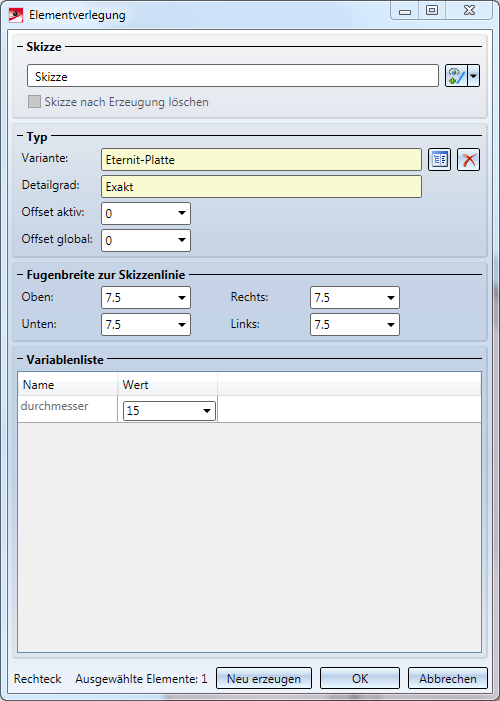 - Nun können Sie beide Teile wieder speichern und die Unterkonstruktion sowie die Elementverlegung aktualisieren. Im Dialogfenster Elementverlegung erscheint dabei die Variable durchmesser, wo Sie ihren Wert festlegen können.