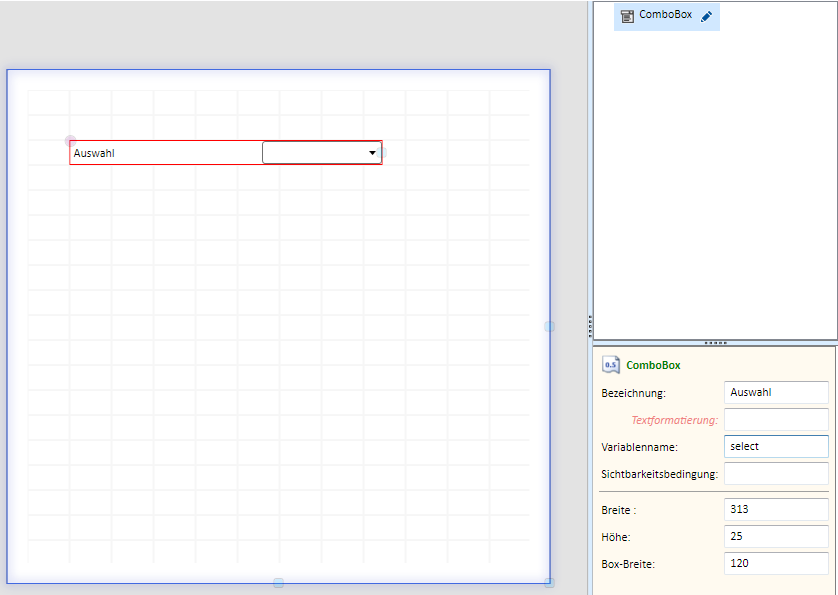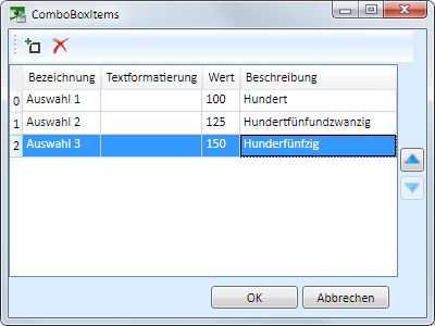 Im Unterschied zum Objekt EditBox sind die Einträge der Auswahlliste hier zweizeilig. Der Text der zweiten Zeile wird in der Spalte Beschreibung definiert.