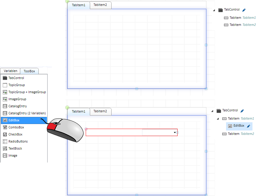 Die Toolbox-Objekte Tabcontrol, TopicGroup und ImageGroup können andere GUI-Objekte enthalten. Wird hier in das Innere des Objektes geklickt, dann wird der innere Rahmen blau markiert. Wenn Sie jetzt ein Toolbox-Objekt so in einen blau markierten Rahmen ziehen, dass der Anfasspunkt des Objektes im Inneren des blauen Rahmens, dann wird es dem GUI-Objekt untergeordnet, zu dem der blaue Rahmen gehört.