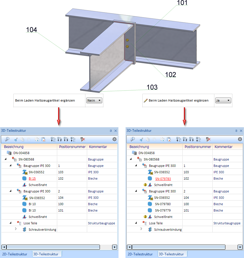 In diesem Beispiel ist eine neue Konstruktion angelegt und in die Datenbank eingetragen worden. Anschließend wurden zwei IPE-Profile eingebaut und mit dem Anschluss Profil an Steg mit 2 Blechen + Steife (1211) verbunden worden. Die Bleche Bl 15 und Bl 10 sind aus dem Halbzeug-Katalog gewählt worden und haben in der HELiOS Datenbank einen Artikelstamm. Die Abbildung zeigt anhand des ICN den Unterschied der verschiedenen Einstellungen im Konfigurationsmanagement.