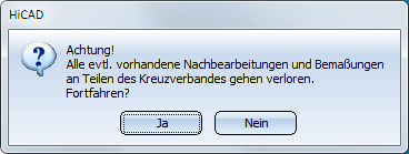 Wenn Sie einen Kreuzverband nachträglich bearbeiten (Doppelklick auf das Feature) und dann eine andere Anzahl von Profilen wählen, dann gehen evtl. vorhandene Nachbearbeitungen und Bemaßungen an Teilen des Kreuzverbandes verloren. HiCAD zeigt dazu eine entsprechende Meldung an: