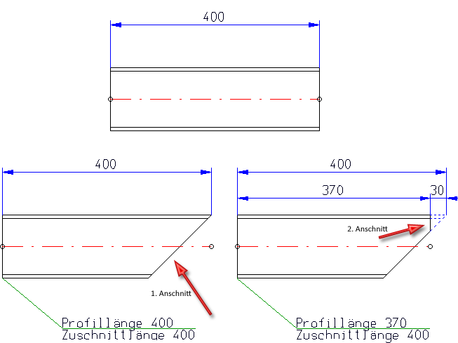 Beim Anschneiden von Profilen ist der dem Teileattribut Länge zugeordnete Wert nicht die Länge des Zuschnitts, sondern die Gesamtlänge des zugeschnittenen Profils. Wird ein Profil doppelt angeschnitten, dann ist die ermittelte Länge das Minimum der Gesamtlängen, die sich ergeben, wenn jeweils nur ein Anschnitt durchgeführt wird. Die Profillänge und die Zuschnittlänge sind dann gleich.