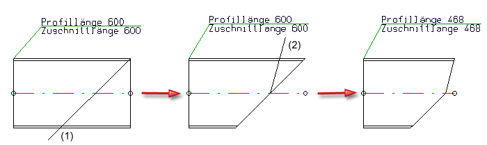 • Beim Anschnitt mit Verlängern werden die Profillänge sowie der Anschnittwinkel am identifizierten Profilende verändert!