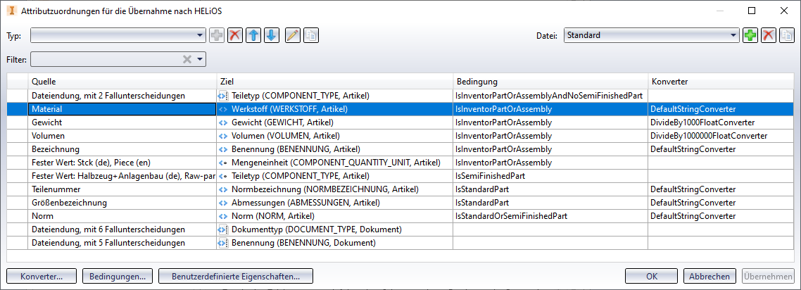 Als Default bereits eingerichtet ist in den Attributzuordnungen für die Übernahme nach HELiOS eine Zuordnung zwischen Quellattribut Material und Zielattribut Werkstoff.