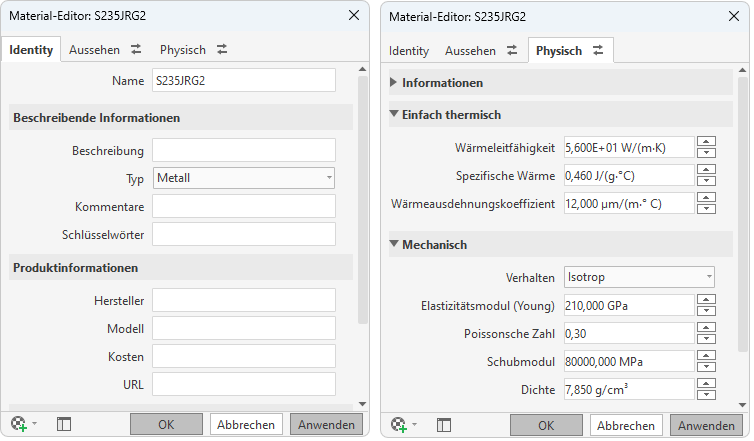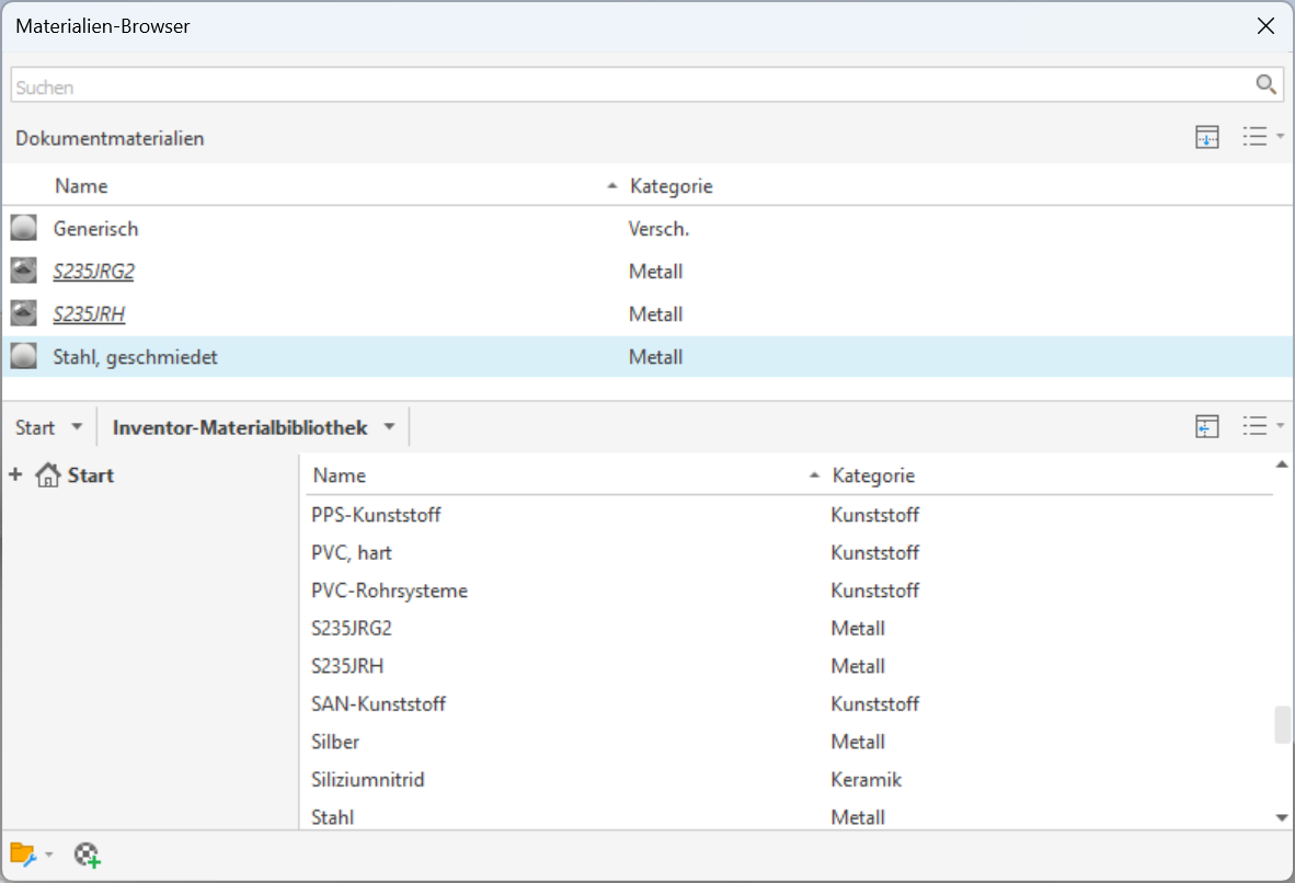 Als Beispiel dafür wurden im Material-Browser von Inventor zwei Dokumentmaterialien ("S235JRG2" und "S235JRH") angelegt und zu der Inventor-Materialbibliothek hinzugefügt.