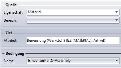 In den Attributzuordnungen für die Übernahme nach HELiOS wird das Quell-Attribut "Material" einem entsprechenden Zielattribut (hier: Benennung des Werkstoffs, Artikel-Referenzattribut) zugeordnet,