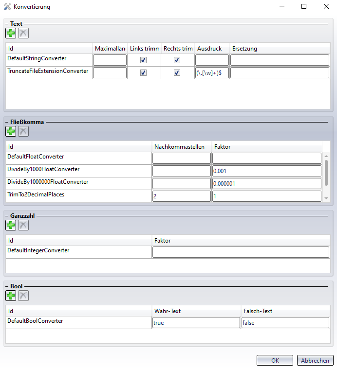 Vergeben Sie in der Zeile, die der Liste hinzugefügte wurde, durch Eingabe und Enter eine eindeutige Bezeichnung in der Spalte Id und machen Sie entsprechende Angaben den gewünschten Konvertierungsoptionen betreffend.
