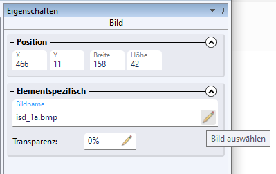 Sie können ein Bild auch nachträglich austauschen, indem Sie das gewünschte markieren und im Eigenschaften-Fenster unter Elementspezifisch auf