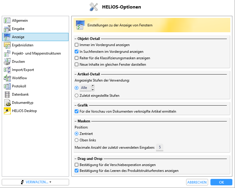 In den Einstellungen zu der Anzeige von Fenstern der HELiOS-Optionen können Sie verschiedene Optionen zum Anzeige-Verhalten definieren