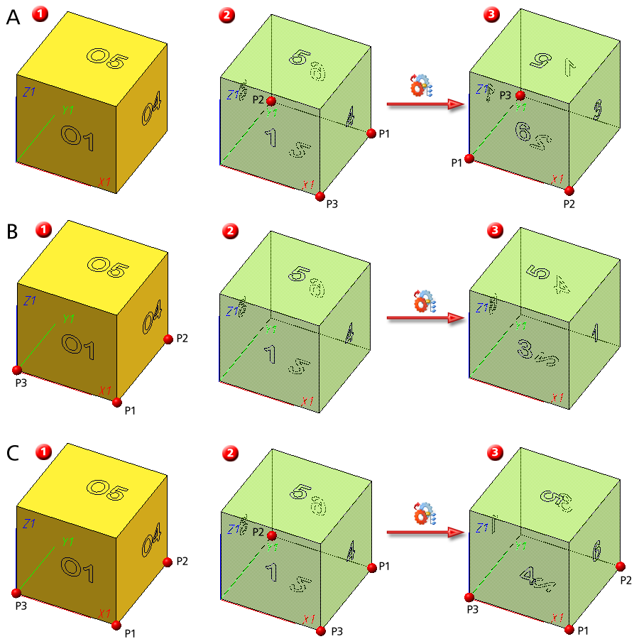 Das neue Teil wird so in der Konstruktion platziert, dass die Richtungen seines Teilekoordinatensystems mit den Richtungen des auszutauschenden Teils übereinstimmen. Die Position des Nullpunktes des Teilekoordinatensystems ergibt sich durch die Passpunkte. Wenn Sie also bei der Bestimmung der Passpunkte in beiden Fällen den Ursprung übernehmen, stimmen die Teilekoordinatensysteme überein.