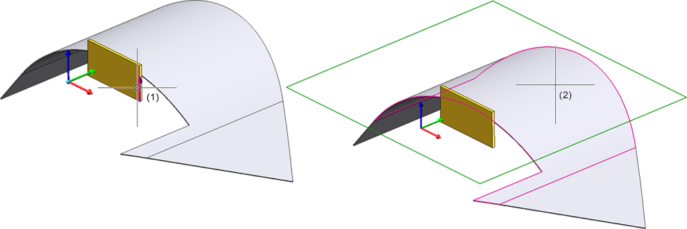 Die Richtung wird in der Konstruktion visualisiert. Ist die Richtung bestimmt, dann wählen Sie die Fläche aus, zu der die Bearbeitungsebene tangential verlaufen soll. Zulässig sind nur analytische Flächen.