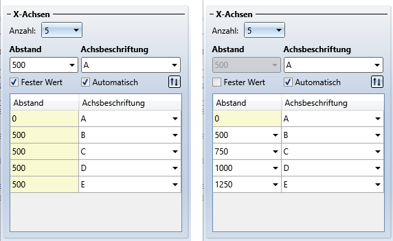 Für gleichmäßige Achsenabstände aktivieren Sie die Checkbox Fester Wert und geben dann im Feld Abstand den gewünschten Abstand der Achsen ein. Sollen die Achsen unterschiedliche Abstände haben, dann deaktivieren Sie die Checkbox und tragen Sie die Abstände in die Tabelle ein.