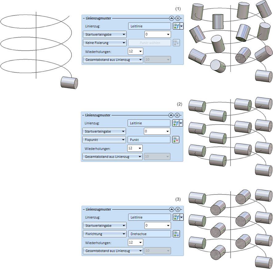 In diesem Beispiel sind Wiederholungen eines Zylinders als Linienzugmuster erzeugt worden. Der abgebildete Linienzug ist eine Spirale. Es wurden verschiedene Einstellungen verwendet.
