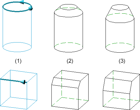 (1) Gewählte Kante mit tangential anschließender Kante, (2) Fasen mit tangentialer Fortsetzung, (3) Fasen ohne tangentiale Fortsetzung