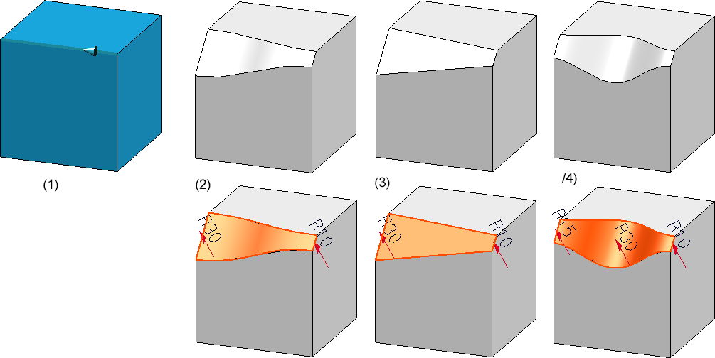 (1) Gewählte Kante, (2) Unterschiedlicher Anfangs- und Endradius mit tangentialem Übergang, (3) Unterschiedlicher Anfangs- und Endradius mit linearem Übergang, (4) Unterschiedlicher Anfangs-, End- und Zwischenradius mit tangentialem Übergang