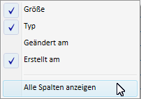 Um Spalten der Dateiliste ein-/auszublenden, klicken Sie mit der rechten Maustaste auf eine Spaltenüberschrift und wählen dann im Kontextmenü die gewünschten Spalten.