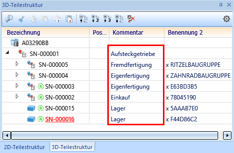 Rechts sehen Sie - anhand des Teileattributes Bemerkung - wie sich die unterschiedlichen Sortierkriterien auf die Vergabe der Positionsnummer auswirken. Für die Attribute Sachnummer, Teileart und Werkstoff/Material wurde immer Nur Unterscheidung gewählt.