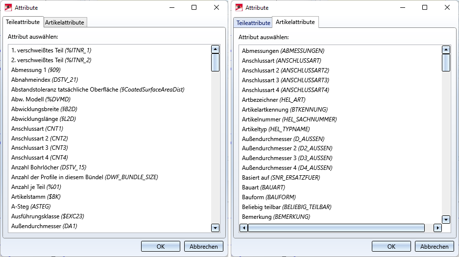 Um ein Unterscheidungskriterium zu bearbeiten, d. h. ein anderes Attribut als Unterscheidungskriterium zu wählen, markieren Sie das gewünschte Kriterium mit dem Cursor und klicken dann auf (Alternative: Doppelklick). Anschließend wird eine Liste der zulässigen Attribute zur Auswahl angezeigt. Dabei wird unterschieden zwischen HiCAD-Teileattributen und HELiOS-Artikelattributen.