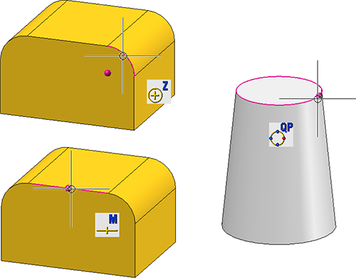 Die gefundenen Punkte sowie die zur Bestimmung des Punktes relevante Ursprungsgeometrie werden farbig (Sonderfarbe, Markierung 1) hervorgehoben, z. B. der Kreis bei Quadrantenpunkten, der Bogen/Kreis beim Zentrum oder die Strecke beim Mittelpunkt.