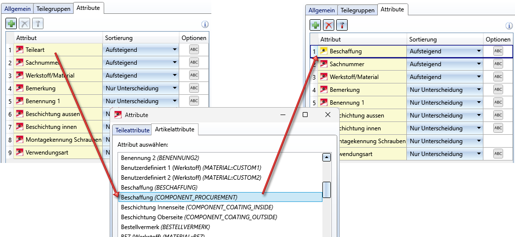 Auf der Registerkarte Attribute wählen wir anstelle des Teileattributes Teileart das Artikelattribut Beschaffung ( COMPONENT_PROCUREMENT).