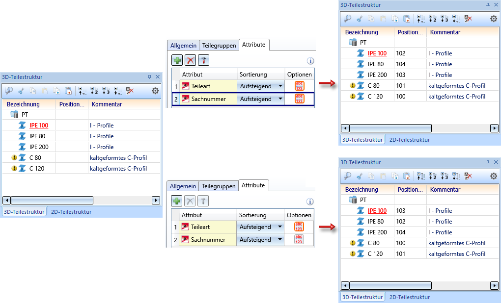 Rechts sehen Sie - anhand des Teileattributes Bemerkung - wie sich die unterschiedlichen Sortierkriterien auf die Vergabe der Positionsnummer auswirken. Für die Attribute Sachnummer, Teileart und Werkstoff/Material wurde immer Nur Unterscheidung gewählt.