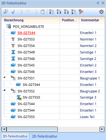 Wird die oben abgebildete Sortierung nicht verändert, dann werden Baugruppen zuerst positioniert, dann Einzelteile, lose Teile, Normteile und zum Schluss sonstige Teile.
