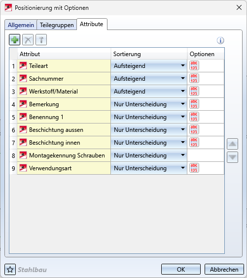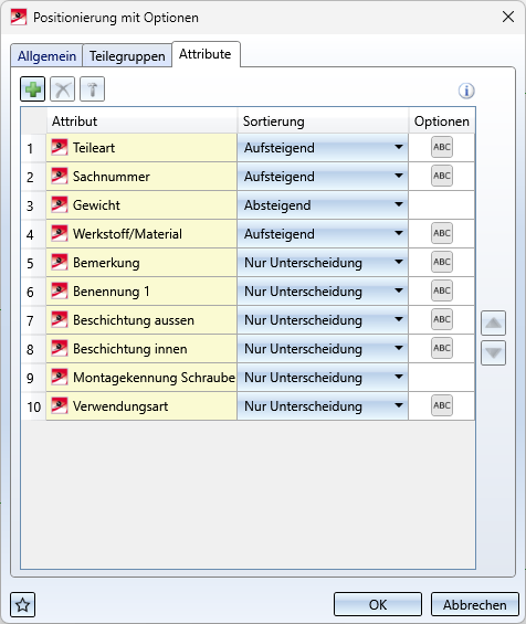 • Die Reihenfolge der Unterscheidungskriterien sowie die jeweils gewählte Sortierung beeinflusst die Positionsnummernvergabe.