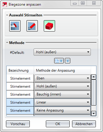 Bei Default tragen Sie die Methode zur Anpassung der Biegezone ein. Die Defaulteinstellung kann für ALLE oder SELEKTIERTE Stirnelemente übernommen werden.