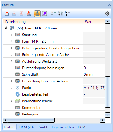 Die Stanze wird in das Featureprotokoll des Blechteils eingetragen und kann mit einem Doppelklick auf den Eintrag für die Form geändert werden.