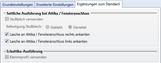 Beim Attika-Anschluss kann der Einbau auch ohne letzte Lasche erfolgen, indem Sie bei Länge Abkantung den Wert 0 eingeben.