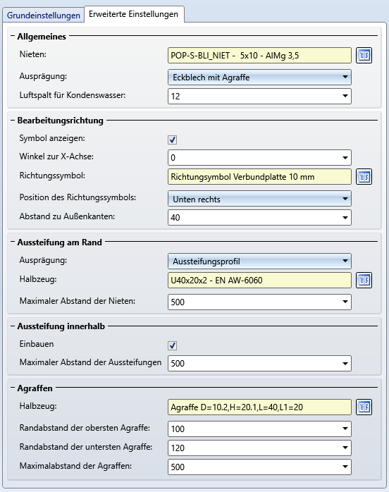 Hier wählen Sie das gewünschte Halbzeug sowie die Parameter für den Anschluss oben, am Fußpunkt, links und rechts. Darüber hinaus können Sie hier wählen, ob Normteile (zur Befestigung) eingebaut werden sollen oder nicht. Die ISD-seitige Voreinstellung ist, dass Normteile erzeugt werden, d. h. die Checkbox ist aktiv. Bei inaktiver Checkbox werden die Normteile in der Stückliste nicht aufgeführt.
