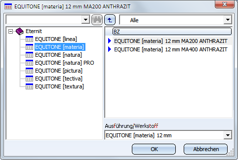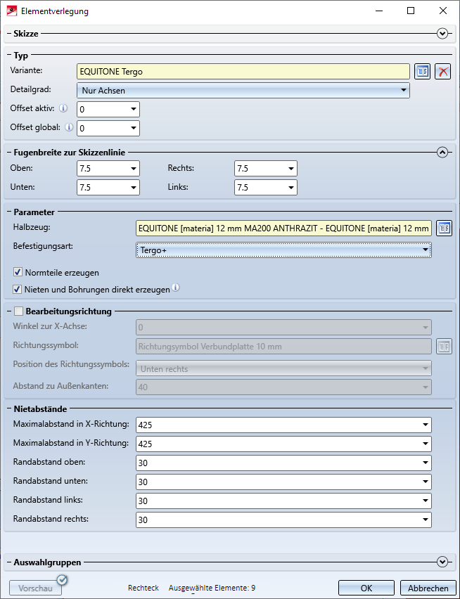 Für Eternit®-Platten vom Typ EQUITONE Tergo stehen im Dialogfenster folgende Einstellungsmöglichkeiten zur Verfügung.