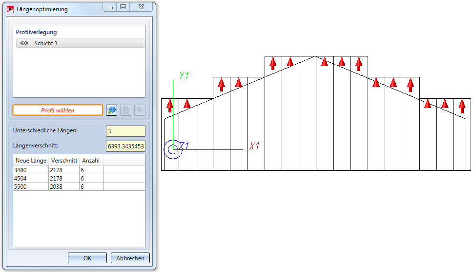 Im oberen Teil werden die aktuellen Werte der gewählten Schicht angezeigt: Unterschiedliche Längen gibt an, wie viele verschiedene Profillängen auf dieser Schicht existieren. Längenverschnitt gibt den Gesamtverschnitt aller Profile der Schicht an.