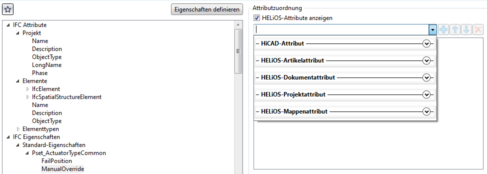 Dabei ist es vom Zielattribut mit abhängig, welche HELiOS-Attribute Ihnen angeboten werden: Für ein Mapping mit dem IFC-Attribut Elemente > Name stehen z. B. die Attribute der Typen HELiOS-Artikelattribut und HELiOS-Dokumentattribut zur Verfügung, ist das ausgewählte IFC-Zielattribut etwa Projekt > Name,. dann werden Ihnen Projekt- und Mappen-Attribute zur möglichen Zuordnung angezeigt