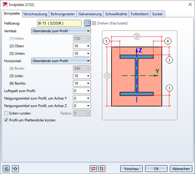 Profil um Plattendicke kürzen Ist diese Checkbox aktiv, dann wird das gewählte Profil um die Dicke der Endplatte gekürzt.