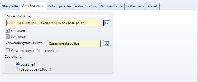 Unter Verwendungsart können Sie festlegen, welche Verwendungsart der Baugruppe des gewählten Profils zugeordnet werden soll. Ist der Baugruppe des Profils bereits eine Verwendungsart zugeordnet, dann lässt sich über die Checkbox Verwendungsart überschreiben festlegen, ob diese Verwendungsart erhalten oder durch die auf der Registerkarte Verschraubung gewählte Verwendungsart ersetzt werden soll.
