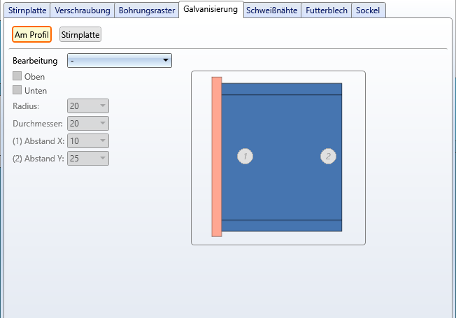 Hier legen sie fest, ob die Endplatte und das Bezugsprofil mit Löchern für die Galvanisierung versehen werden sollen. Aktivieren Sie dazu die entsprechenden Register am linken Rand.