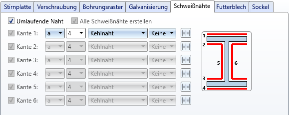 Auf dieser Registerkarte legen Sie durch Aktivierung der entsprechenden Checkboxen fest, welche Schweißnähte erzeugt werden sollen: