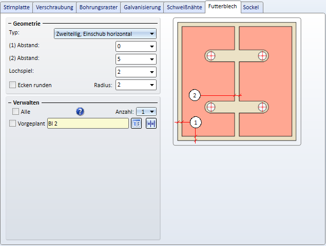 Sollen Futterbleche zwischen den beiden Stirnplatten eingesetzt werden, dann können Sie Anzahl, Typ und Größe dieser Bleche auf der Registerkarte Futterblech festlegen.