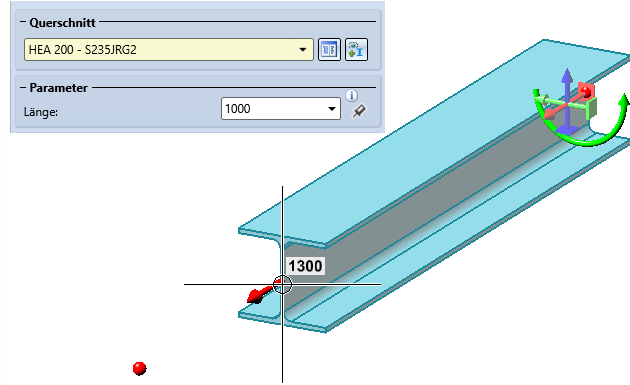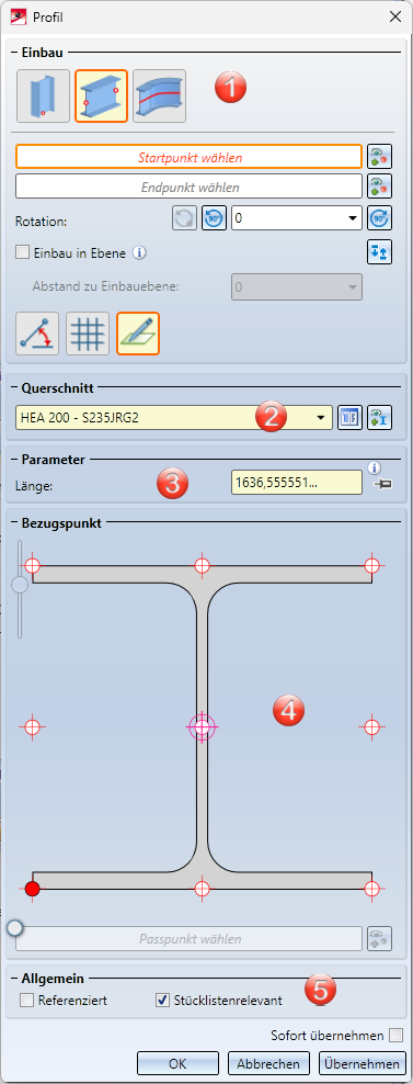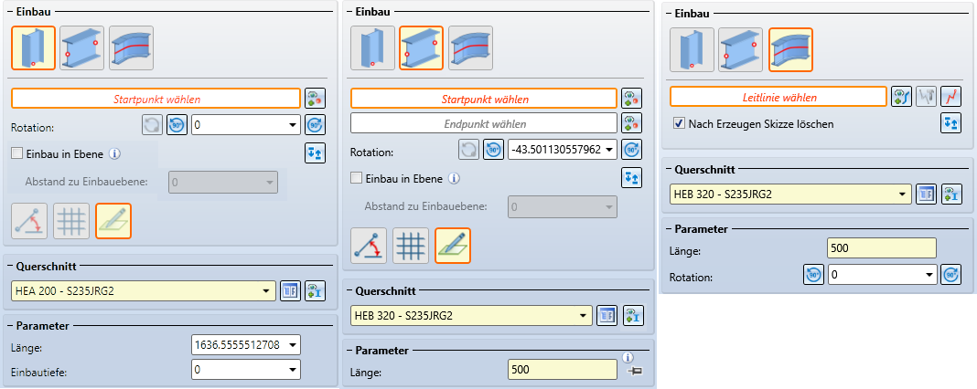 Dort wählen Sie den gewünschten Querschnitt aus und geben die erforderlichen Parameter wie die Profillänge, den Drehwinkel oder die Richtung ein. Welche Parameter explizit angegeben werden müssen, hängt von der gewählten Einbauart und dem gewählten Querschnitt ab.