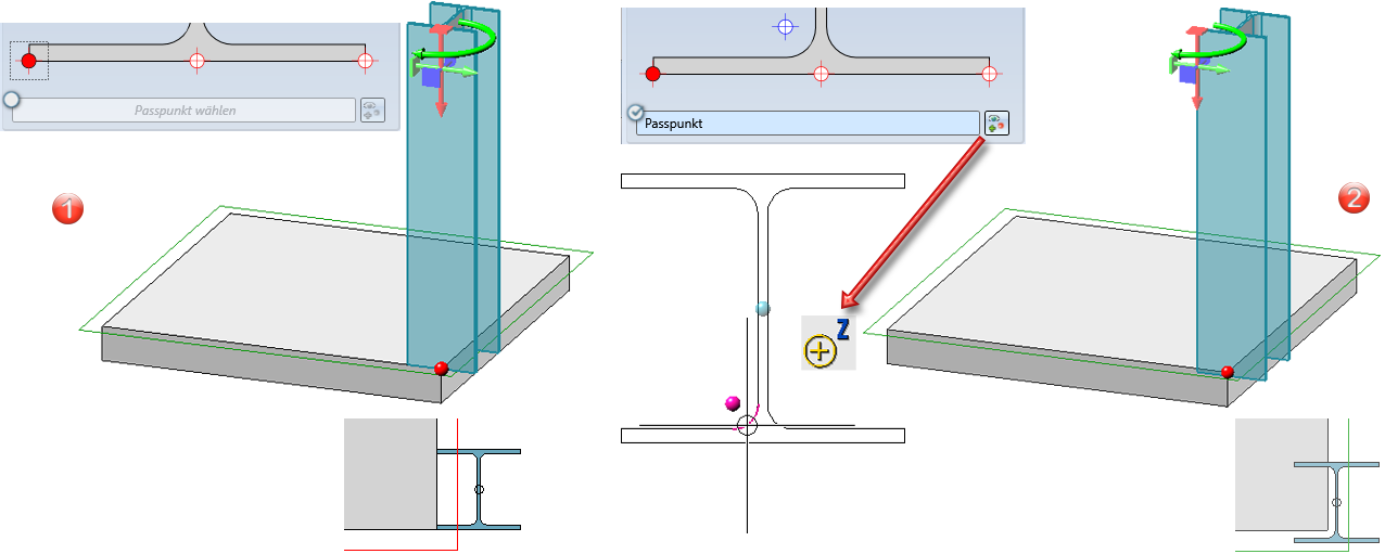Als Einbauhilfe können Sie auch einen Passpunkt wählen. Dies ist allerdings nicht möglich, wenn Profile entlang einer Skizze verlegt werden.