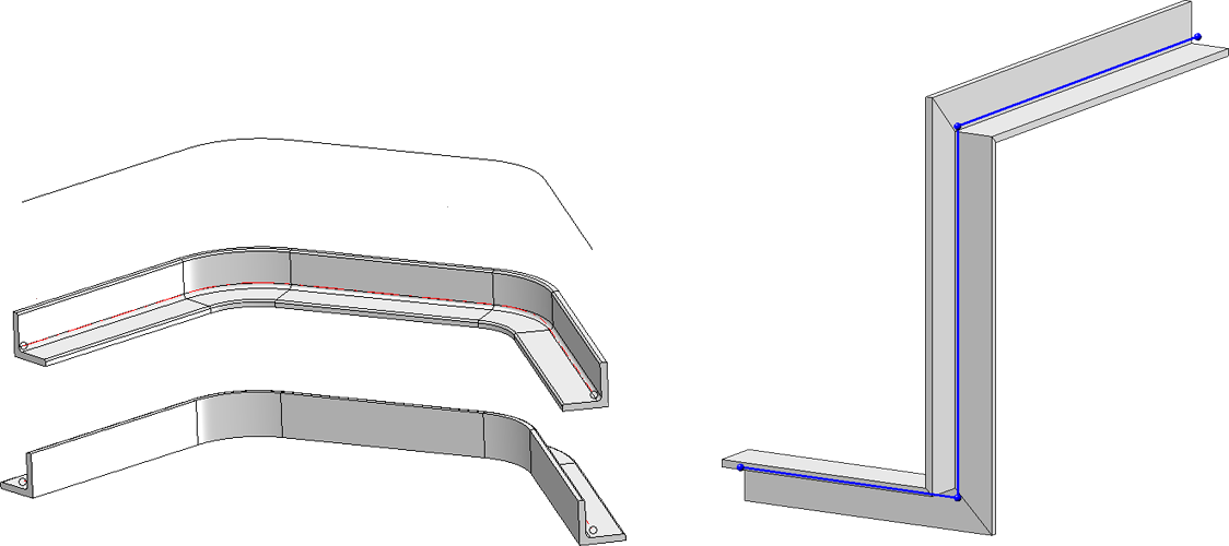 In der folgenden Abbildung ist links ein L-Profil an einer ebenen Skizze einmal ohne, einmal mit vertauschten Endne. Rechts wurde ein L-Profil an einer 3D-Skizze verlegt.