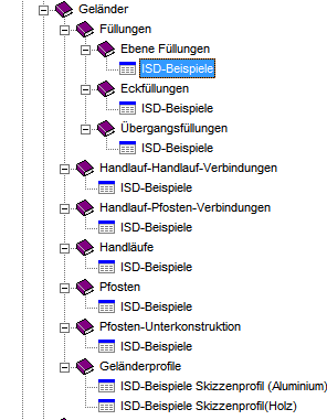 Im Lieferumfang von HiCAD sind ISD-Mustervarianten für die verschiedenen Komponenten enthalten. Diese finden Sie im Katalog Werksnormen > Stahlbau > Geländer.