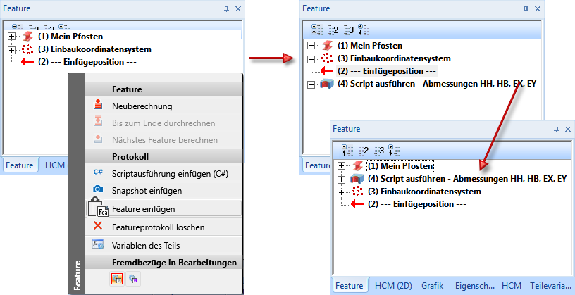 Dann klicken Sie mit der rechten Maustaste in das Feature-Protokoll Ihrer Variante, wählen Feature einfügen und ziehen das Feature dann an die richtige Position hinter das Körpererzeugungsfeature.