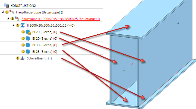 Für ein geschweißtes Kastenprofil wird eine stücklistenrelevante Baugruppe erzeugt. Der Name dieser Baugruppe setzt sich zusammen aus dem Text Baugruppe und der Sachnummer des Profils, also z. B. Baugruppe II 1000x20x500x30x500x22. Darunter liegt das eigentliche Profil (als nicht stücklistenrelevante Baugruppe), dem die Bleche (Flachstähle) zugeordnet sind. Eines der Bleche - in der Regel eines der Stegprofile - ist das Baugruppen-Hauptteil.