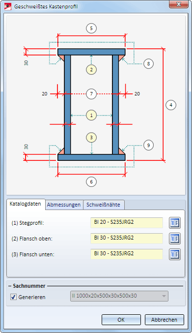 Unter Sachnummer legen Sie die Profilbezeichnung fest. Ist die Checkbox Generieren aktiv, dann wird die Sachnummer automatisch generiert. Die Voreinstellung ist