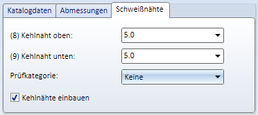 Sollen Kehlnähte eingebaut werden, dann aktivieren Sie die Checkbox. Geben Sie die Schweißnahtdicke an und wählen Sie - falls gewünscht - die Prüfkategorie. Diese wird benötigt, wenn Sie Schweißnaht-Prüfprotokolle erstellen wollen.